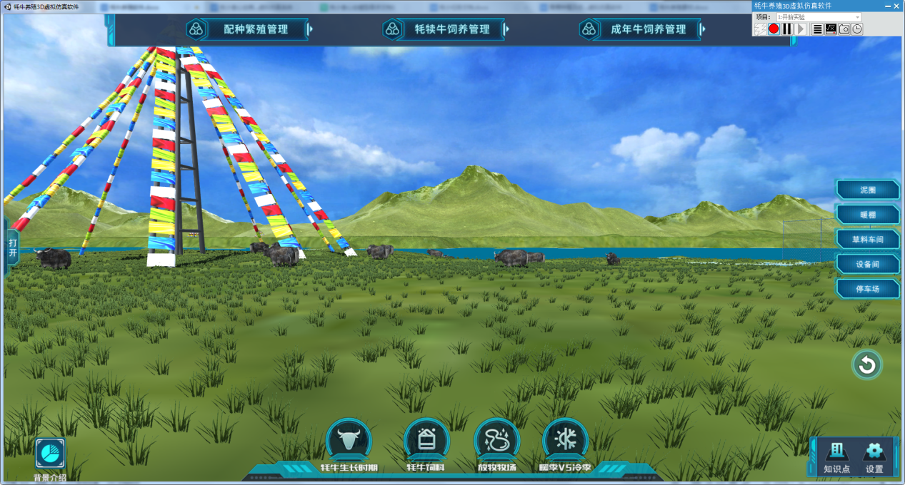 (1)软件搭建的3D场景真实还原青海地区牦牛养殖环境,突出生态畜牧业的教学理念,学生可以通过软件与牦牛进行近距离的接触和真实的养殖操作。