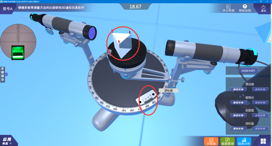 分光计调节过程有按步完成和一键完成双模式,既可满足不同实验阶段的训练要求,也可迅速跳转实验模块。
