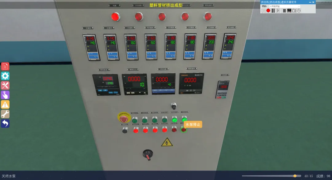 分为演示模式和操作模式,演示模式下可以正确模拟挤出成型每一步的操作,学员只需点击步骤进行每一步操作;操作模式下,给出具体操作步骤,学员点击相应开关或按钮进行操作。