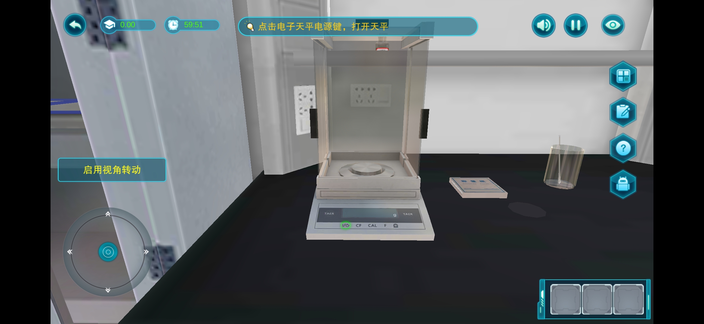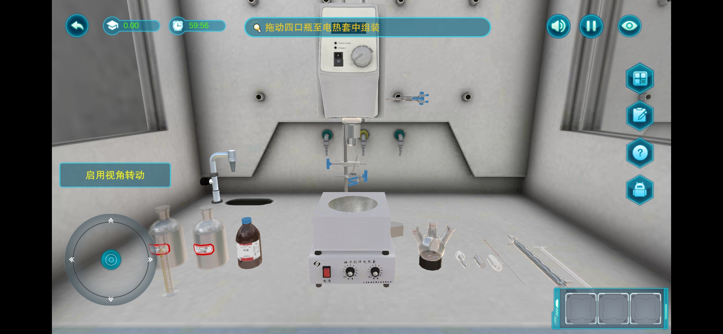 用户可通过虚拟手柄在实验场景内漫游,使用手指滑动屏幕进行360°旋转。点击仪器按钮或者拖动实验器具进行实验操作。