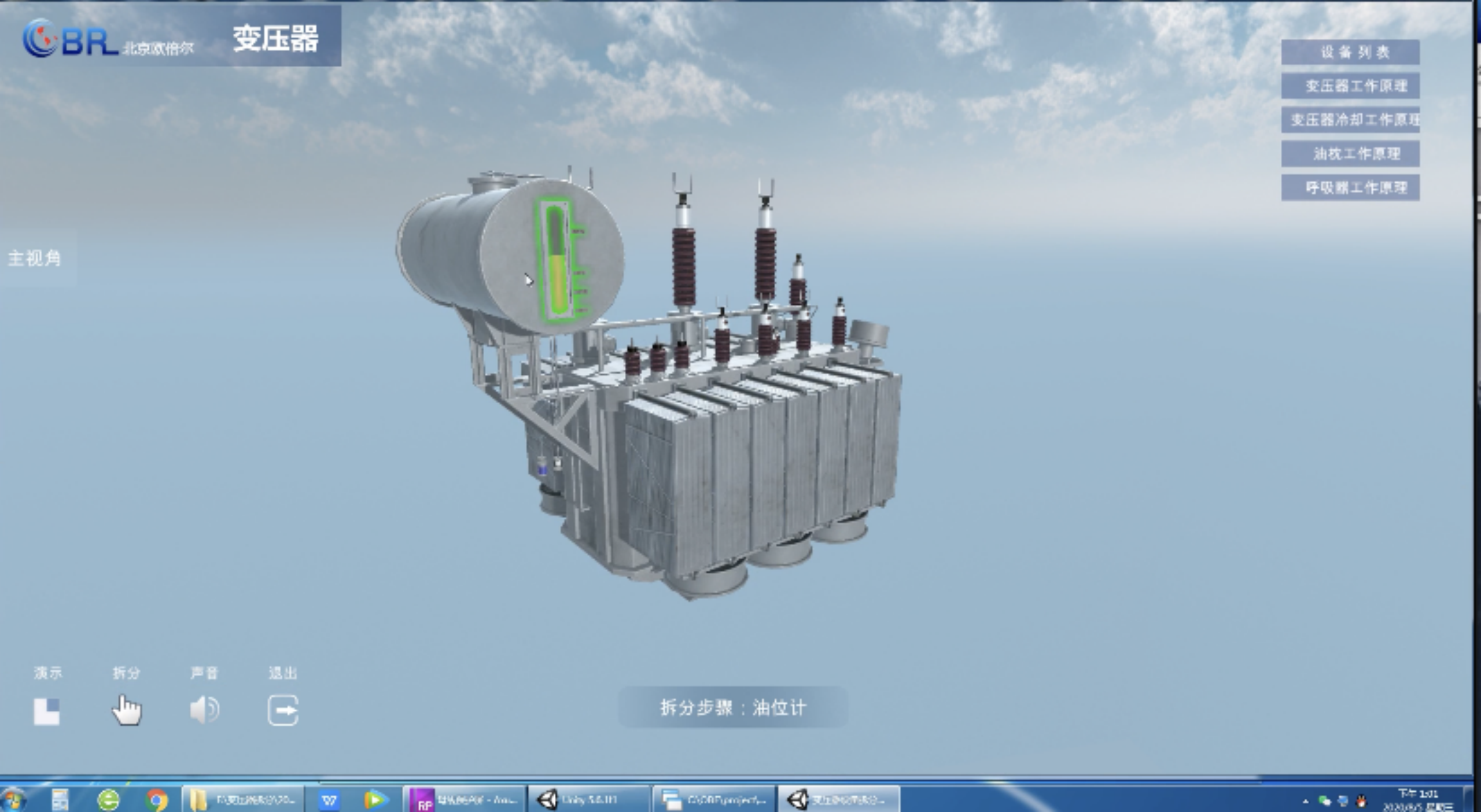 欧倍尔变压器虚拟仿真软件以油浸式变压器为仿真对象,建立完整的变压器模型,让学员了解变压器的主要组成、运行流程以及工作原理。逼真的变压器三维模型使学员更有兴趣了解变压器,为未来工作奠定基础。