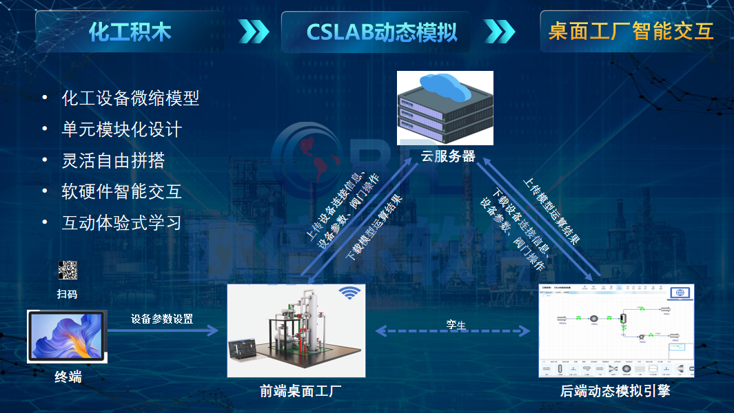模块化的积木组件通过云服务器与化工动态模拟引擎建立数据通讯,积木组件讲化工工艺搭建的拓扑结构上传至服务器,化工动态模拟引擎通过服务器获取拓扑结构,并自动生产单元模型连接关系,从而形成化工工艺。这种通讯的建立同时支持积木组件的相关操作与模型计算数据的获得,从而形成一个高仿真度的积木工厂,完成工厂的一般操作与运行。手机终端可以对积木组件进行相关参数的设定,从而增加模型可设计性。