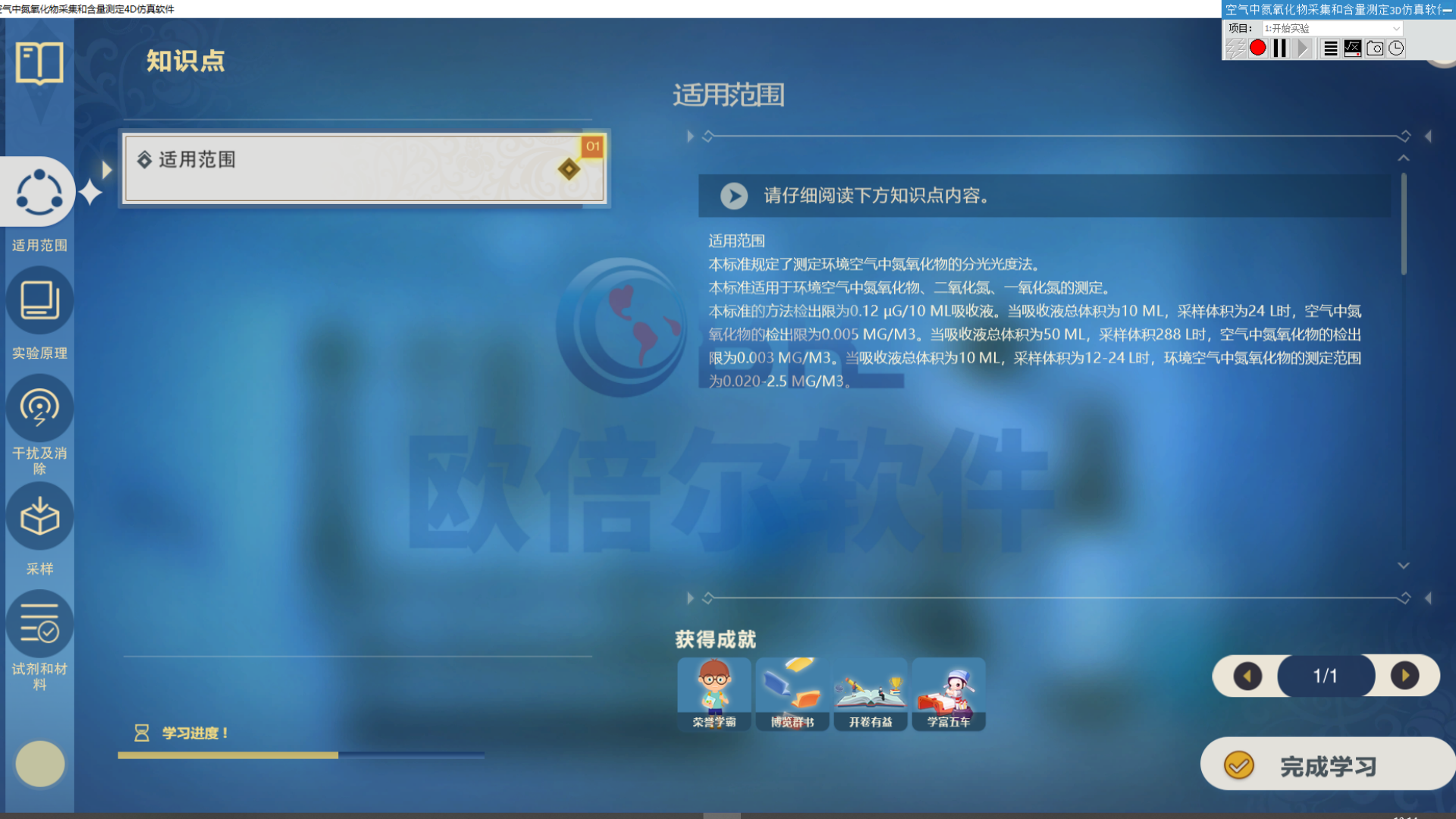 空气中氮氧化物采集和含量测定3D仿真软件严格按照《中华人民共和国国家环境保护标准》(HJ 479-2009)环境空气氮氧化物(一氧化氮和二氧化氮)的测定,采用盐酸萘乙二胺分光光度法对空气中的氮氧化物(一氧化氮和二氧化氮)进行测定。