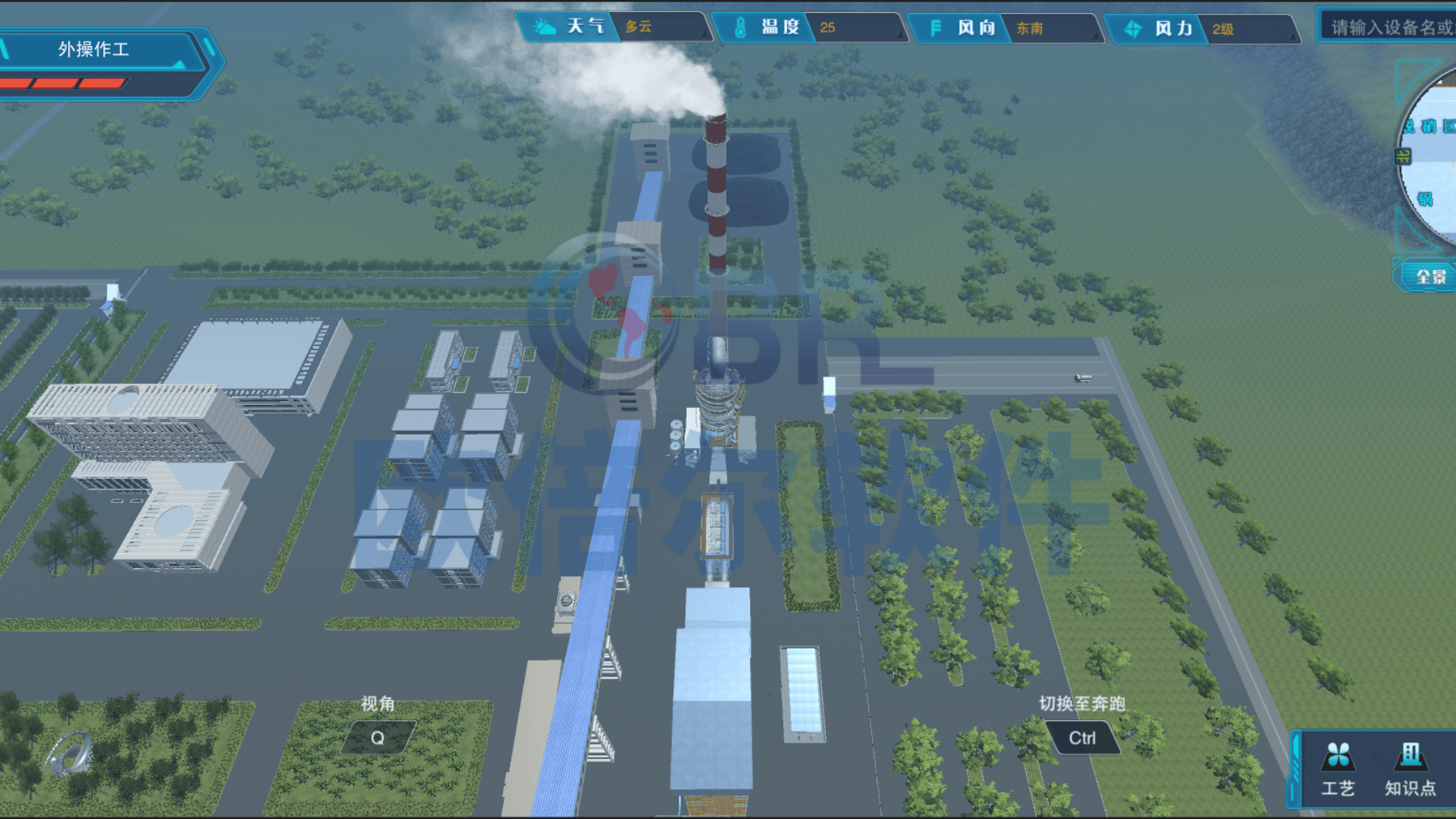 燃煤电厂大气污染物排放协同控制及迁移扩散虚拟仿真实训教学软件以3D形式展示典型烟气处理的真实生产工艺过程,全面仿真模拟氨区操作、SCR脱硝过程、静电除尘过程、湿法脱硫操作、湿式电除尘操作、石膏脱水工艺等,以及配套的工艺原理。学员可以在仿真工厂环境中漫游,学习典型烟气处理工艺的工厂设计要求,在环境中可以实现360°旋转。将工艺流程制作成多个工序,实现工厂仿真模拟功能,文字形式展示工艺知识点,对工艺流程进行理论学习。
