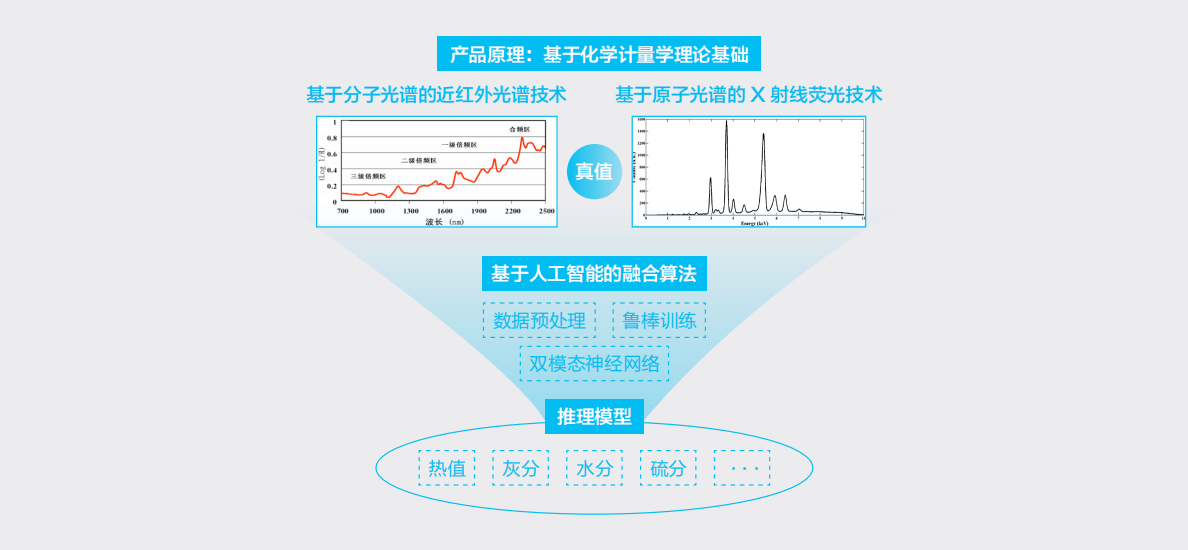 煤质快速分析仪基于分子光谱的近红外光谱技术和基于原子光谱 X 射线荧光光谱技术,并运用人工智能算法对两种信息进行高效提取和融合。从而实现快速、准确、鲁棒、无损的煤炭多成分分析。