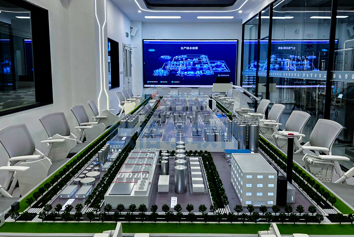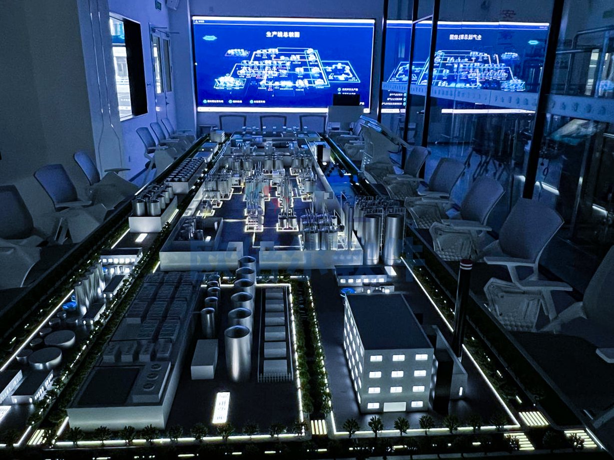 沙盘分为核心展示区、互动操作区和数据监控区,采用ABS塑料与金属框架,设备按1:500比例精细复刻,表面喷涂哑光涂层模拟真实质感,管道系统嵌入光纤,通过编程实现物料流动的动态光影效果,结合LED显示屏,形成沉浸式视觉环绕。