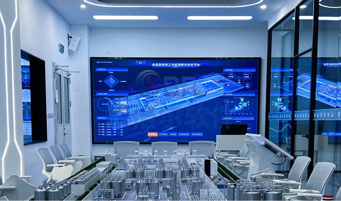 互动操作区配备触控屏工作台,支持多人同时操作;数据监控区集成中控系统,实时对接生产线数据。通过交互性沙盘实践的方式,利用通讯技术采集过程生产数据和信息化大数据技术模拟鲜牛奶、发酵乳和发酵乳饮料生产线及厂区布设,展现工厂生产场景,实现三体联动。
