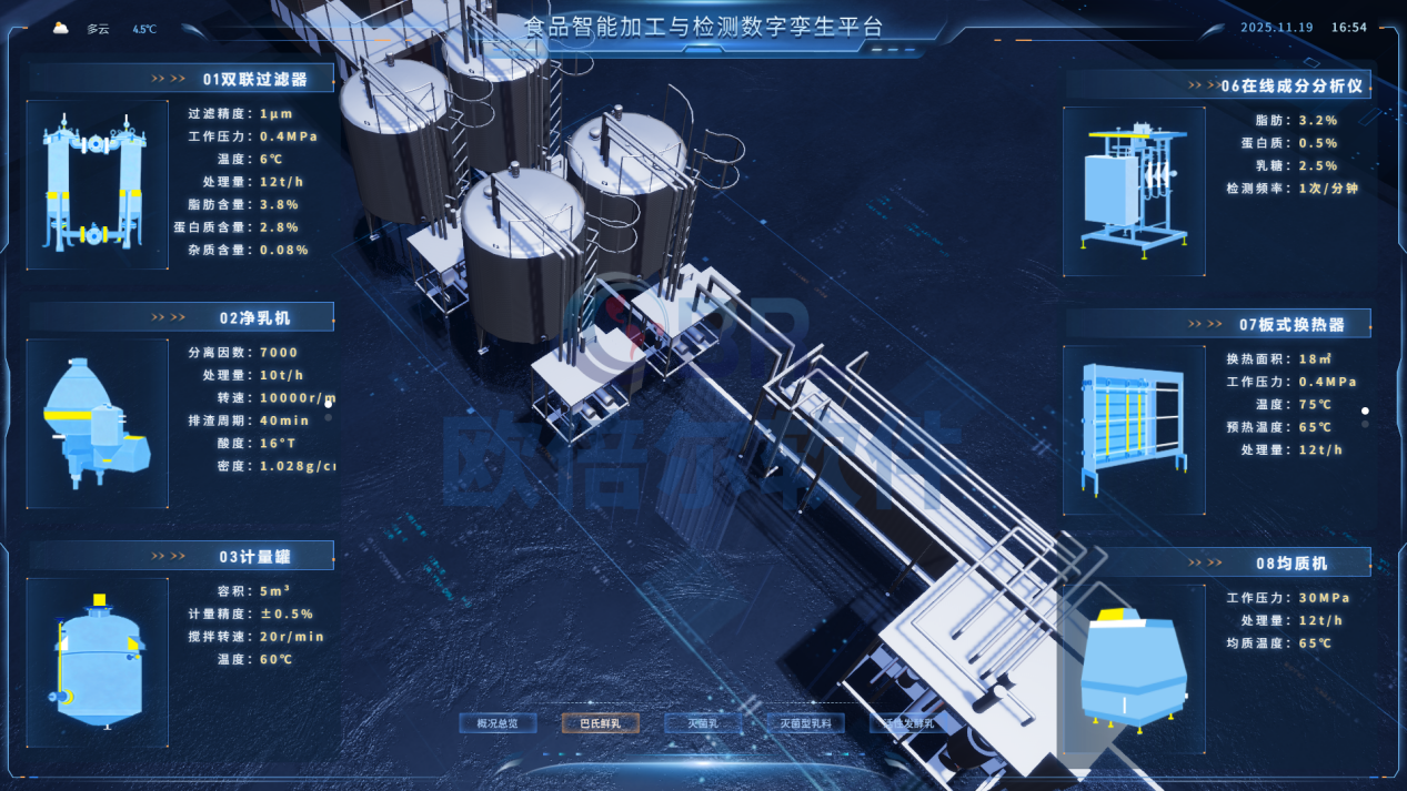 沙盘配套的数字孪生展示界面,从收奶检验开始,脱气、体积计量、冷却、储存,过滤、净乳、均质、脱气暂存、杀菌冷却,无菌缓存罐,无菌灌装,冷却、包装、入库等环节,通过传感器实时采集沙盘设备的运行参数,实时映射厂区真实运行数据,并以3D可视化、数据图表、动态曲线等形式同步呈现。