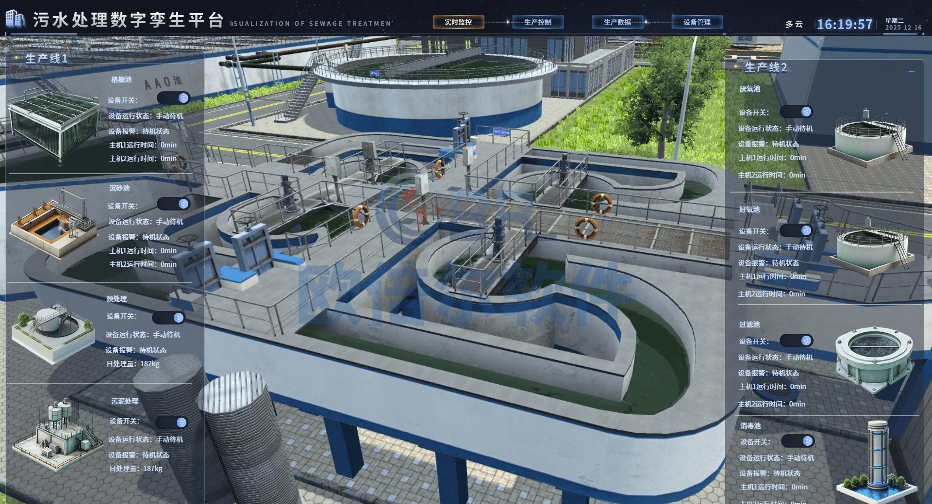 装置采用1:1高精度建模,完整还原污水处理全流程设备与工艺。整合智能检测技术,实时采集并上传设备运行数据,实现数据采集、控制与可视化管理。数字孪生平台覆盖关键环节虚拟仿真,推动污水处理教学向数字化、智能化转型。