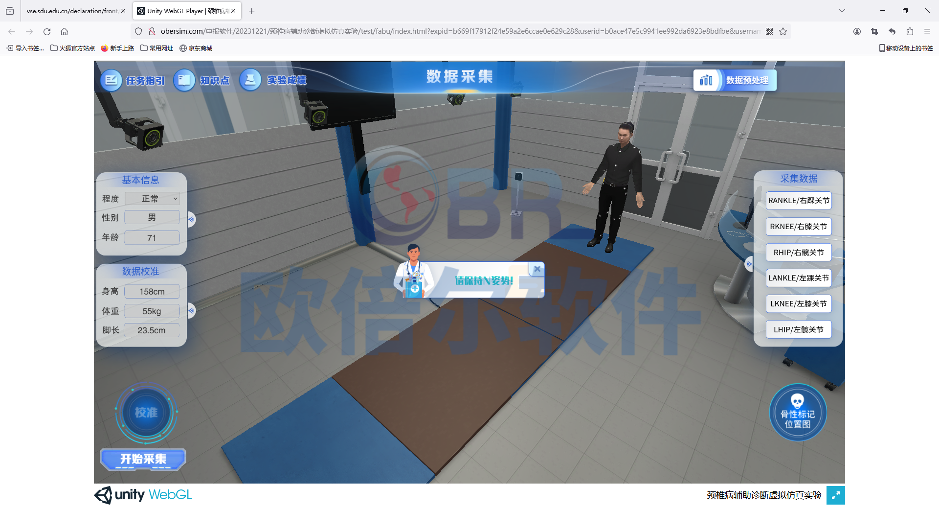 基于数字仿真运行平台开发,以3D形式模拟数据采集、数据预处理、特征提取以及数据分类流程。在虚拟系统里学员自主进行系统参数设置,根据得到的数据可进行机器模型训练和深度模型训练,直至得到最优结果。培训的同时能进一步提高学生对惯性传感器和光学传感器的认识与理解,巩固所学的理论知识,加强了学员动手操作能力。本系统主要包括数据采集、数据预处理、特征提取和数据分类四个组成模块,实现对包括步态、心电、脑电、心音、脑部核磁共振图等人体生理信息数据的分析和分类等功能。