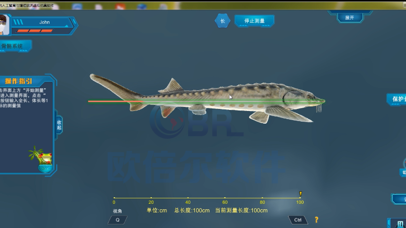 根据软件还原的3D长江鲟模型,从不同角度测量长江鲟的体长、头长、体高、眼径等多个数据,使学员更好的掌握长江鲟的体态以及外形特征。