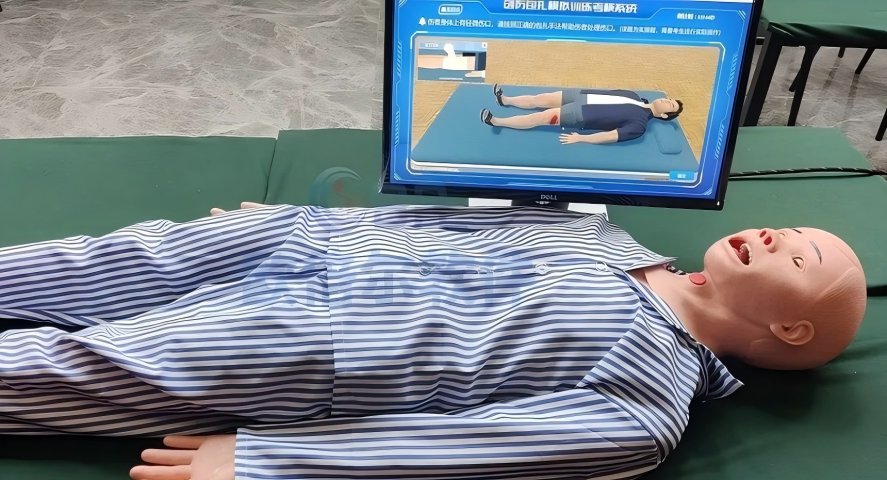 虚实联动的实操训练:软件与物理创伤包扎模拟人通过数据线连接,实现伤口指示、动作检测与操作同步。学员在虚拟场景中接收任务后,需在模拟人上进行真实包扎,系统实时监测操作过程与结果,实现“虚拟引导、实操反馈”的一体化训练。