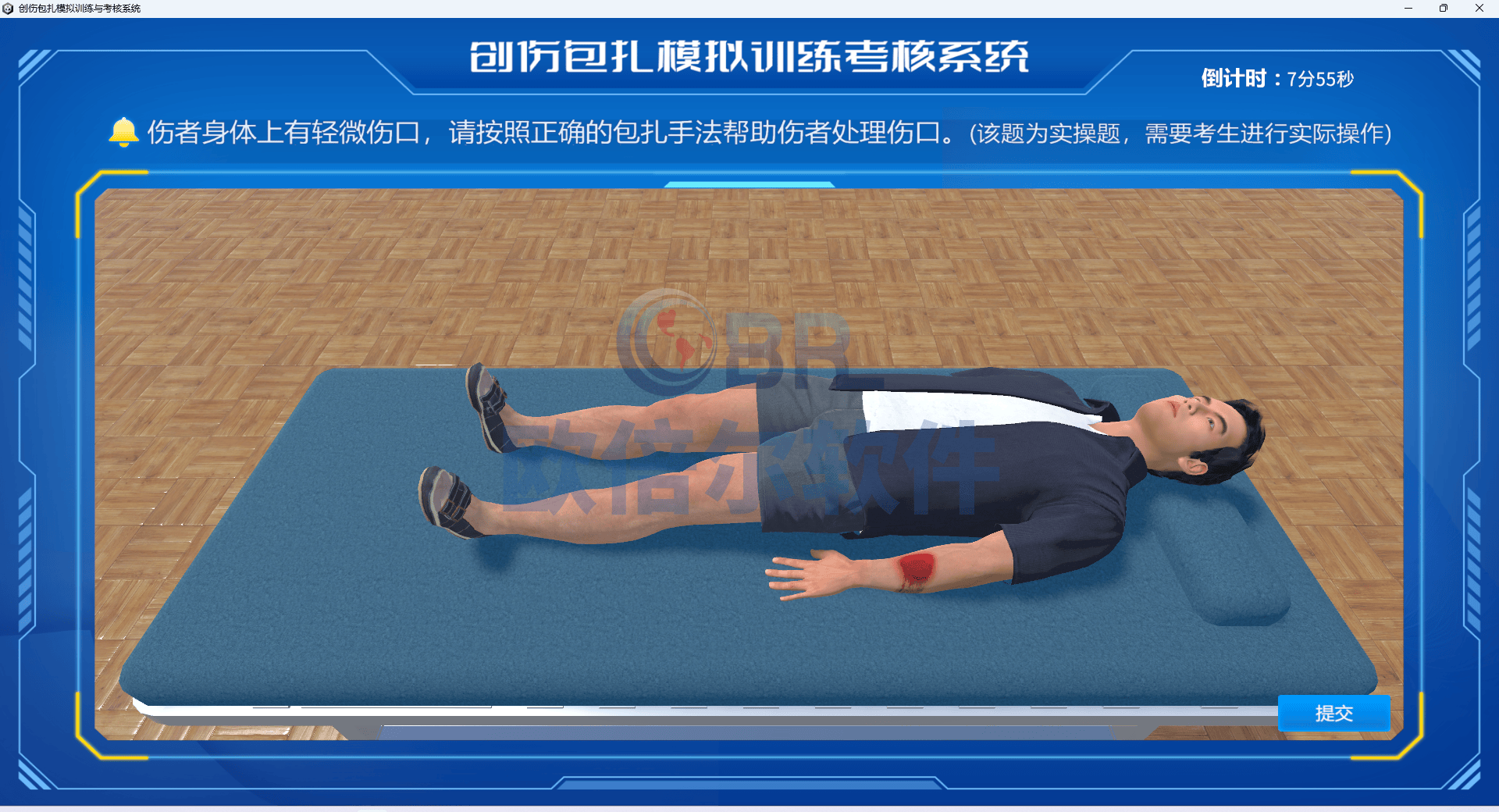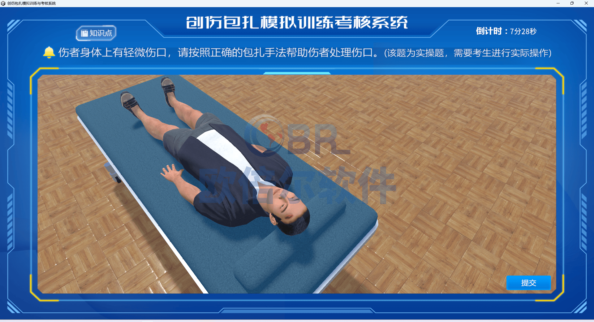练习模式:学员可进行自主训练。系统首先随机生成选择题,测试包扎相关理论知识;随后在3D虚拟场景中随机指定一处伤口(双臂、双腿或头部),物理模拟人对应部位同步亮起指示,学员需使用真实纱布在模拟人上进行包扎操作,完成后系统自动评分并反馈。