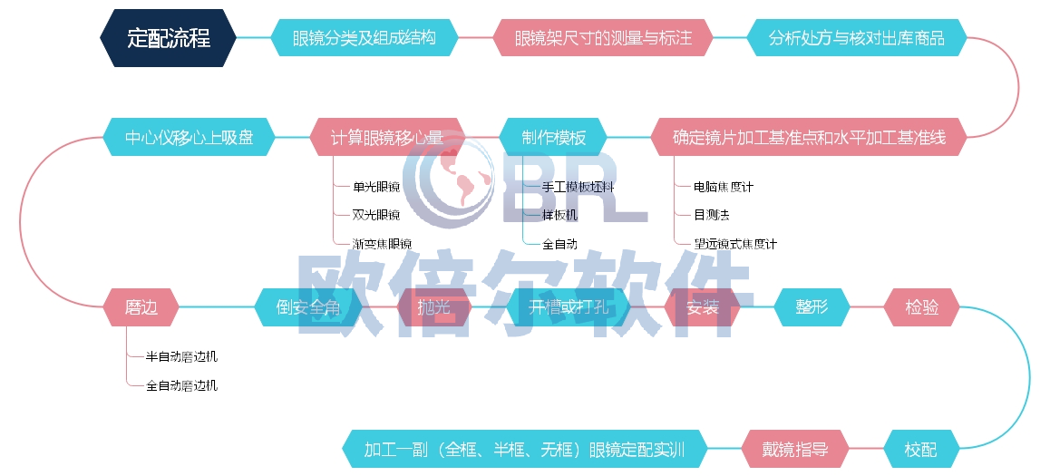 以“一副眼镜定配工作流程”为主线模拟整个过程,将知识学习和技能训练融为一体,让学习者掌握不同类型镜片眼镜(单光眼镜、双焦眼镜、渐变焦眼镜、棱镜眼镜等)的定配,掌握不同镜型眼镜(全框眼镜、拉丝眼镜、打孔眼镜等)的定配。