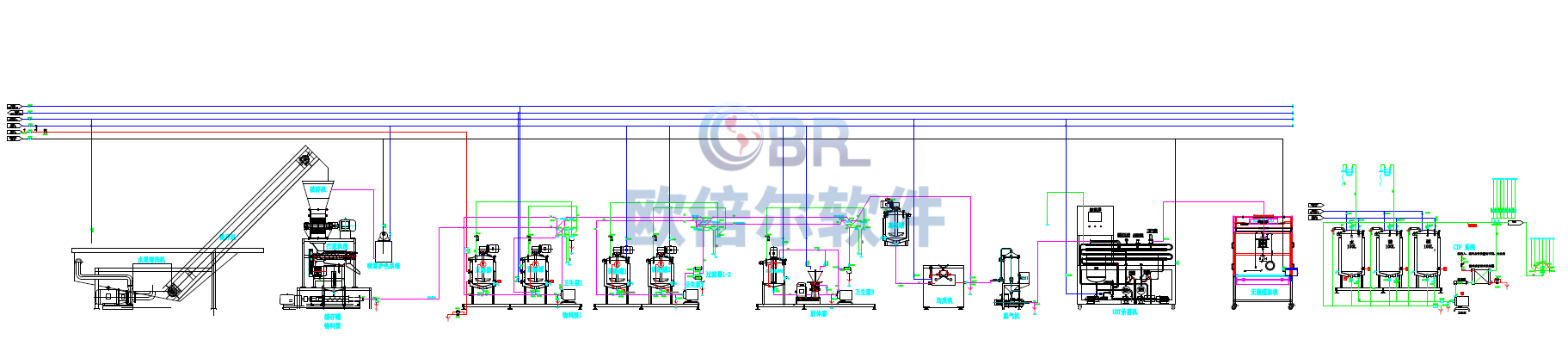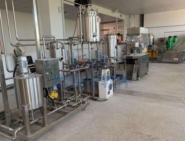 系统由前处理(清洗,拣选,打浆榨汁,萃取罐,)模组;酶解模组(灭酶器,酶解罐);调配发酵模组(发酵罐,调配罐,过滤机,乳化罐);杀菌灌装模组(杀菌机,灌装机,脱气机,均质机);后段杀菌包装系统(巴氏杀菌机,吹干机,装箱台,贴标机等)等组成。以实现不同类型产品生产。