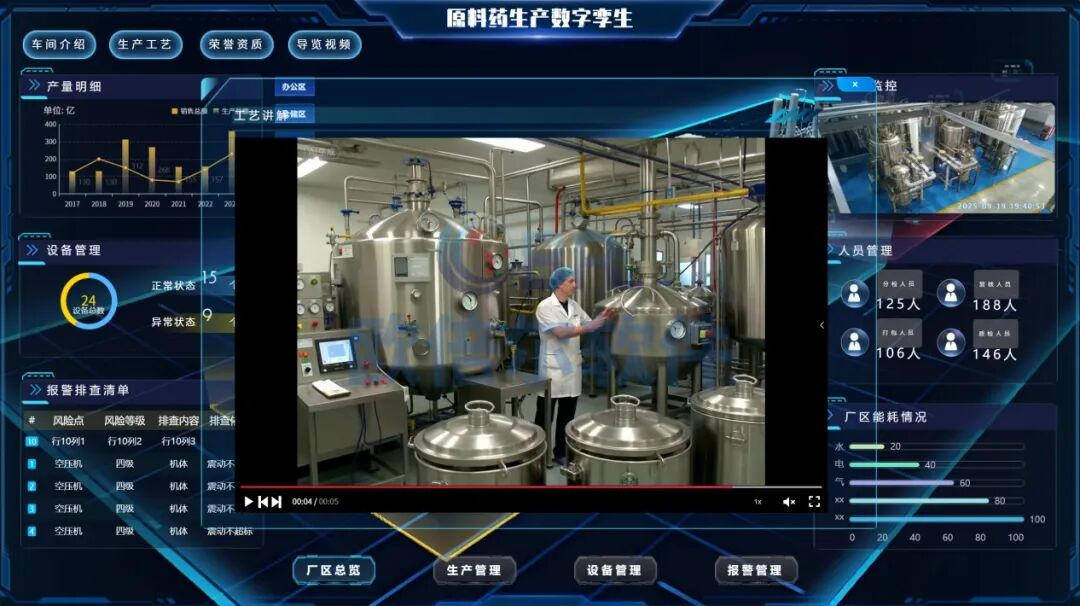 制药数字孪生平台包含药物制剂数字孪生平台、原料药数字孪生平台、生物制药数字孪生平台、中药数字孪生平台,对制药车间生产设备、工艺流程、生产环境进行精准虚拟映射。