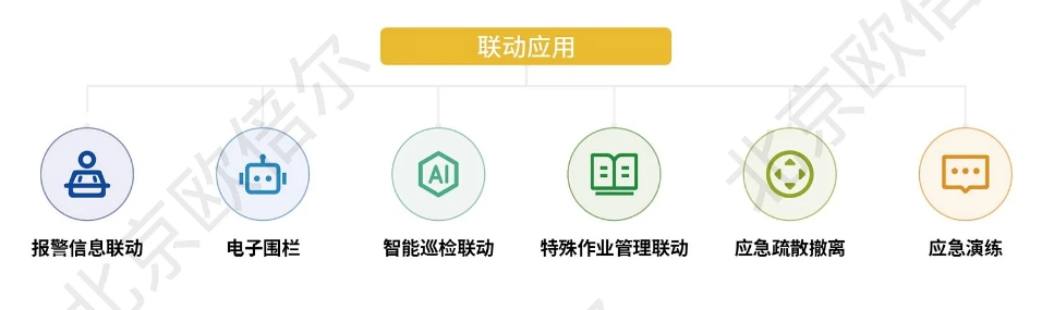 实现报警信息联动,电子围栏、智能巡检联动,特殊作业管理联动,应急疏散撤离、应急演练的联动。