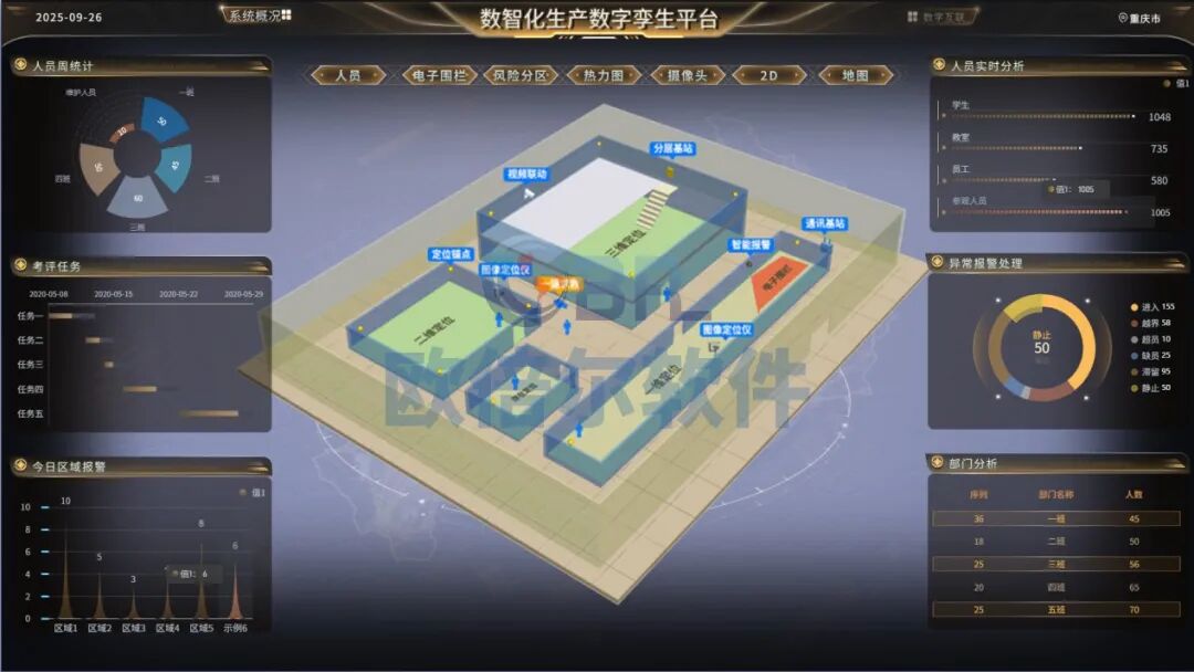 在实训、与生产现场,人的安全与行为是管理核心。本系统通过对厂区内人员的实时位置、分布状态、移动轨迹进行不间断监测,将无形的活动转化为可视、可查、可预警的精准数据。