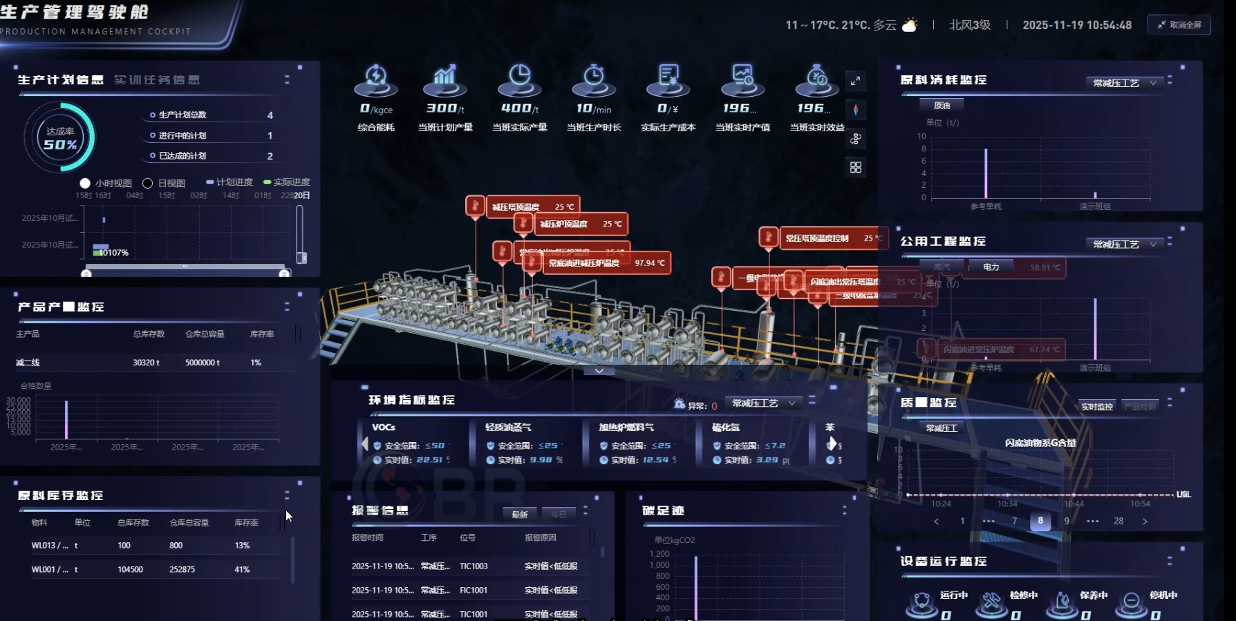 质量管理模块全程护航,覆盖全流程检测与风险预警,异常情况可通过调度管理快速响应、优化资源。全域生产数据实时汇聚至可视化驾驶舱,原料消耗、进度、质量等关键指标一屏尽显。
