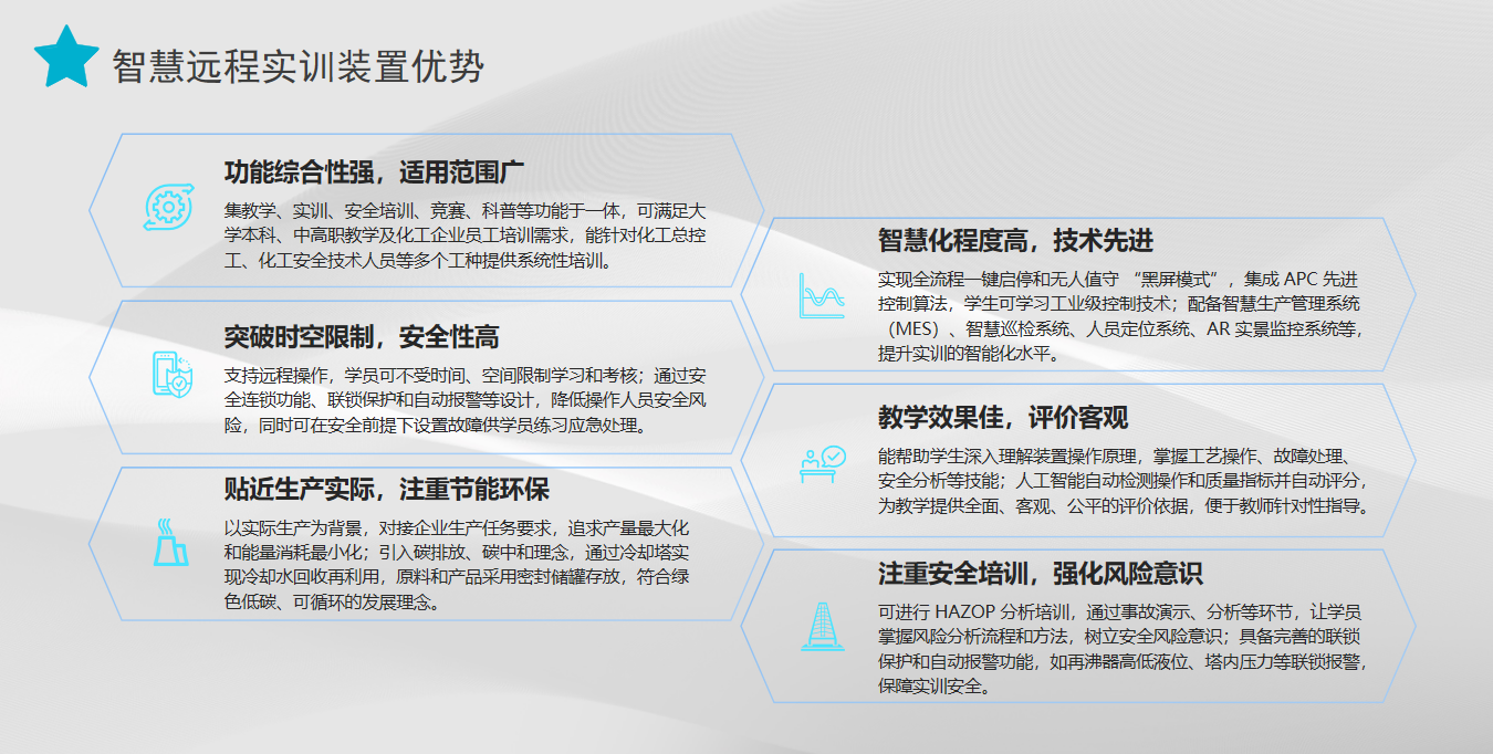 智慧远程实训装置(智慧黑屏工厂)体现人工智能、绿色低碳、可循环、安全、贴近化工生产实际并将互联网技术、物联网技术等数字化技术应用到绿色化工安全远程实训内容中,线上线下交互响应,虚实结合的智慧培训装置。学员可以不受时间、空间等限制,远程操作真实操作远在千里的真实的实验装置,随时随地去学习、考核,操作便捷并降低了实验人员的安全风险。该装置在可以满足学生进行正常的开停车操作进行实验的同时,还可以在精馏塔正常操作状态下制造一些故障(在安全措施保证的前提下)(可以是随机的,也可以定时),产生不正常现象,让学生通过观察实验现象和操作界面的实时数据判断生产操作的异常情况,并做好应急处理措施。