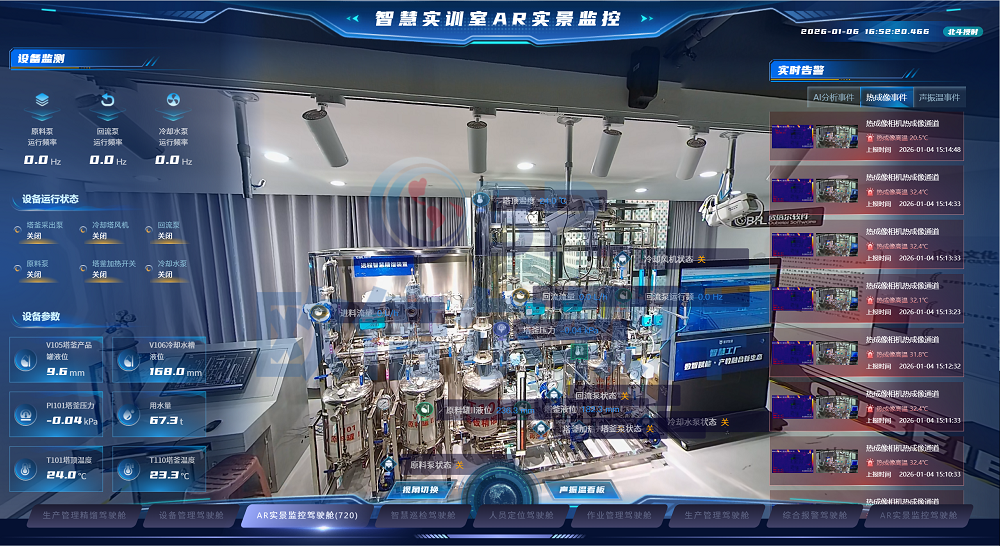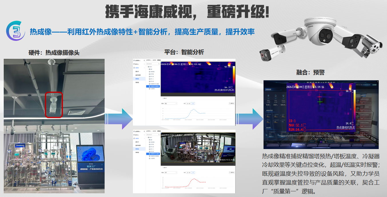 在精馏实训中,精馏塔的预热温度、塔板温度分布以及冷凝器的冷却效果,直接关系到分离效率与 “产品质量”。热成像相机能够精准捕捉每个点位的温度变化,对超温或低温异常进行实时报警。这一功能不仅避免了实训中因温度失控导致的设备风险,又能让学员直观学习 “温度管控对产品质量的影响”,完美契合工厂 “质量第一” 的生产逻辑!