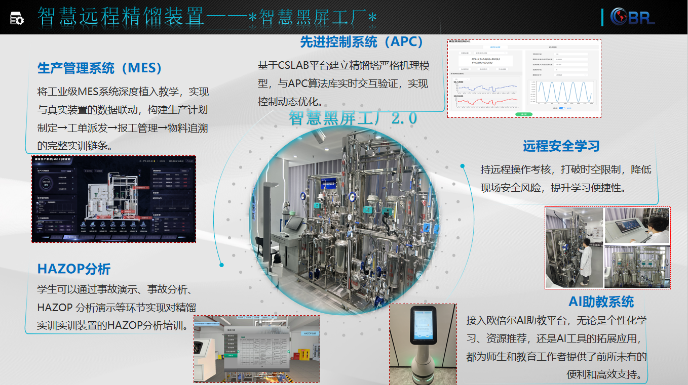 智慧远程实训装置(智慧黑屏工厂)由北京欧倍尔、天津大学,东营职业学院联合研制,装置集教学、实训、安全培训、竞赛、科普等功能于一体的综合性实训装置,适用于大学本科、高职高专和化工企业员工培训。2025年,产品携手海康威视,重磅升级!增加三项核心卖点:
