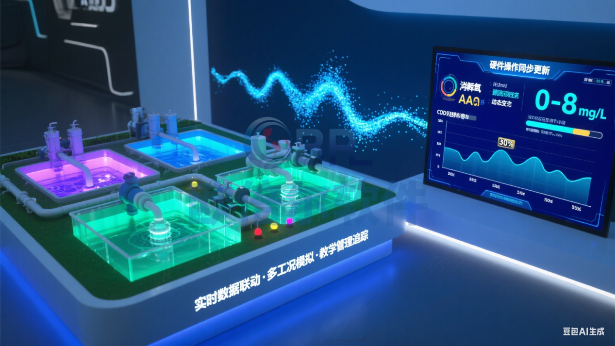 AAO污水处理系统包含格栅机、曝气池、沉淀池、消毒设备等数十种装置,不同工艺对应不同的设备组合与运行参数。传统教学中,学生无法直观看到设备如何与工艺环节匹配,更难理解不同参数设置对实际运行结果的影响等关键关联。