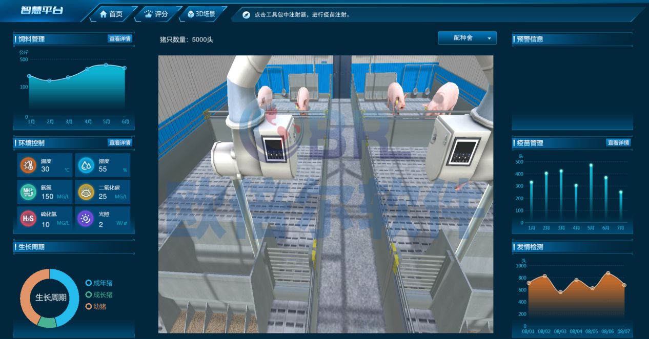 功能二:智能监控系统:包含智能喂养、智能环控、智能监控以及智能预警等监控模块,与3D场景实时联动实现猪的智慧养殖过程。