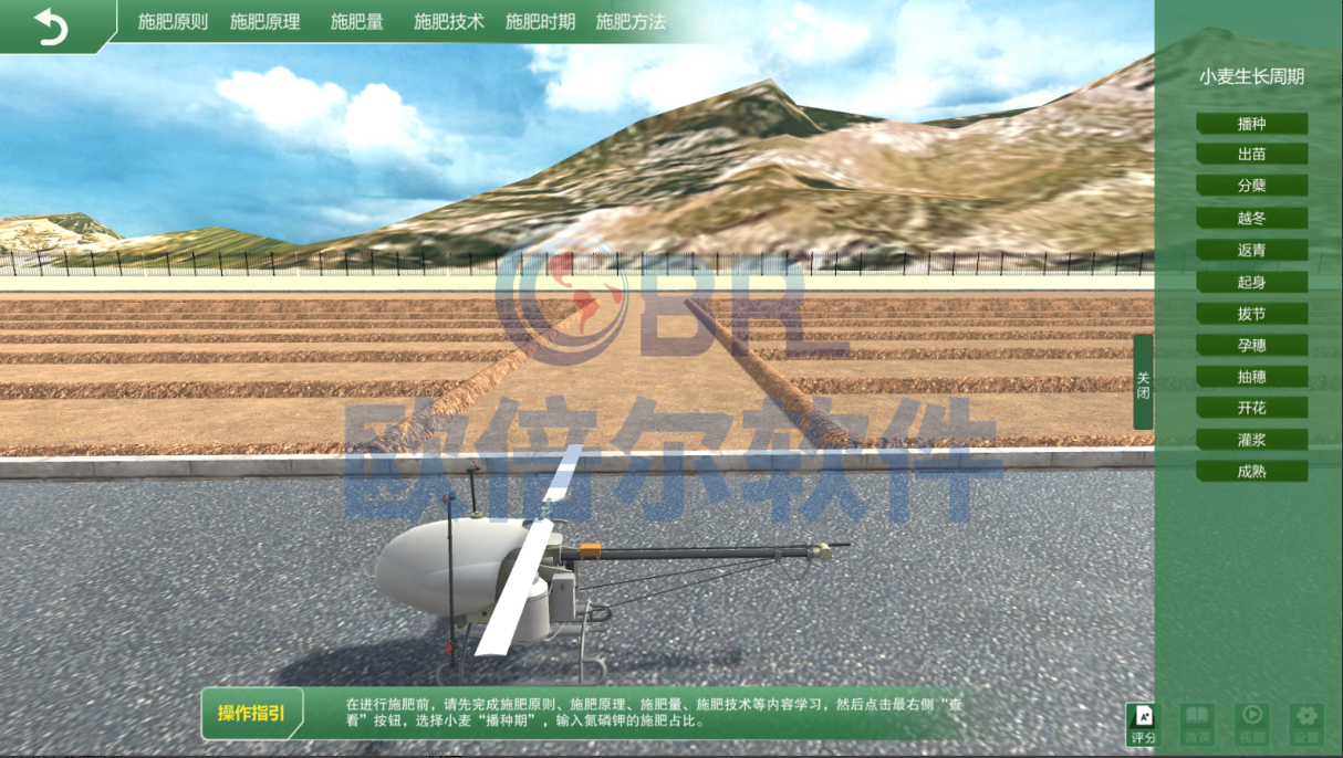 测土配方施肥仿真系统:通过土壤养分检测仪模拟,精准分析主要包括土壤全氮、全磷、全钾、水解氮、速效磷、速效钾、有机质、PH、有效锌、有效锰等指标,绘制出春小麦速效磷与作物相对产量的关系图,模拟使用无人机完成小麦播种期、分蘖期和拔节期的施肥。