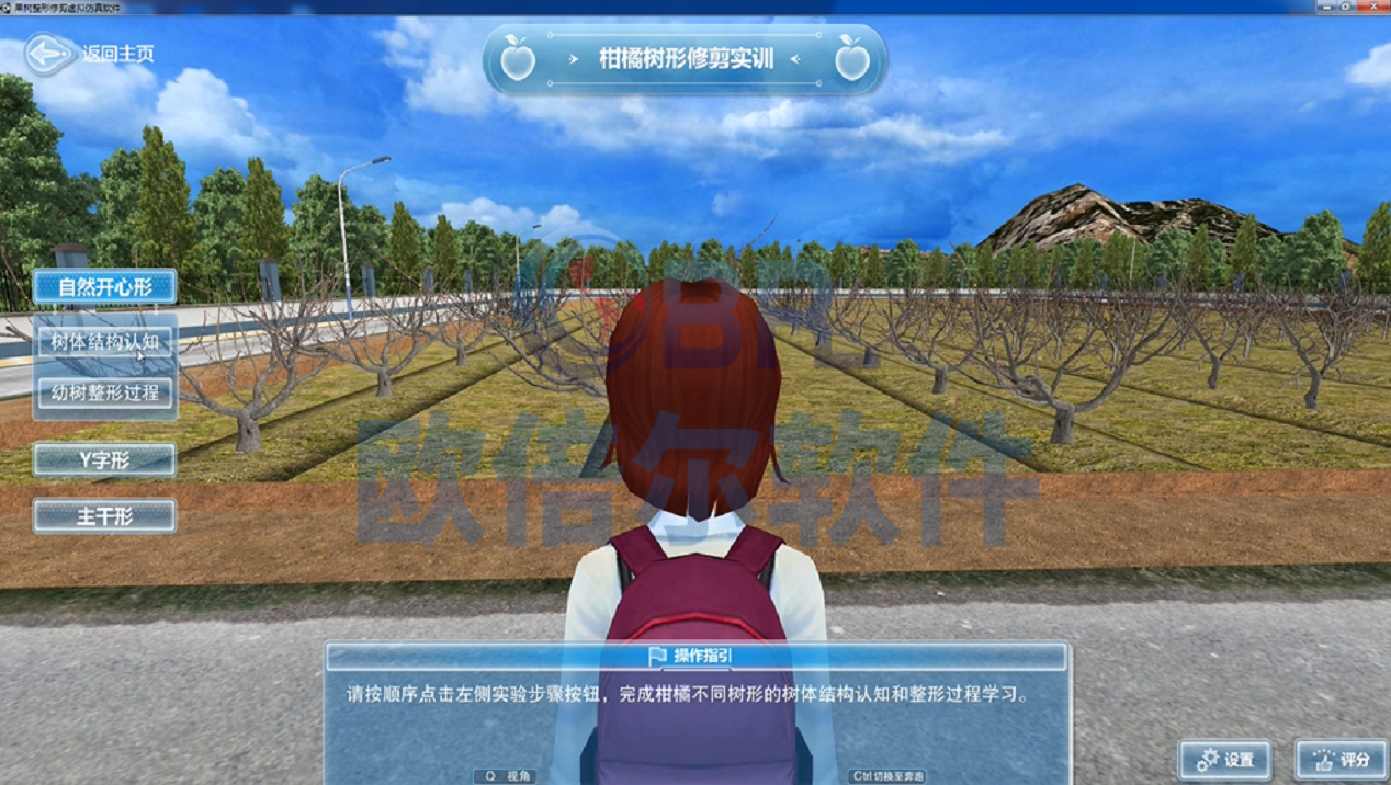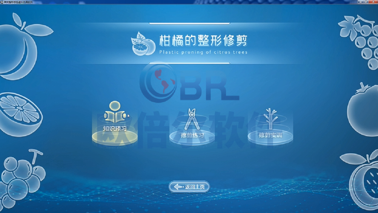 以果树整形修剪为例:模拟桃树、柑橘、葡萄3个树种的整形修剪过程,主要包含幼树整形、生长期修剪、休眠期修剪、修剪实训四个部分,学生可通过本软件的学习,对不同树种、不同树形的树体结构有进一步的了解,并掌握果树整形修剪中的基本操作手法,包含抹芽、拉枝、短截等不少于12种修剪操作,为果树生产中的实际操作奠定基础。