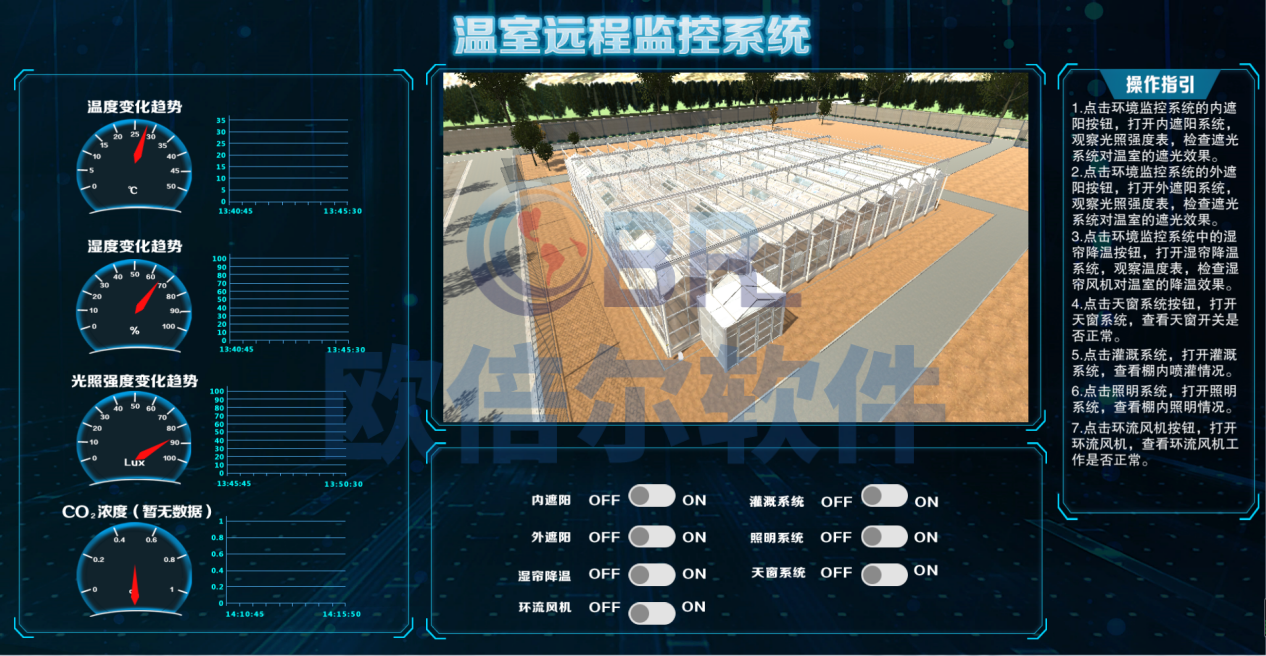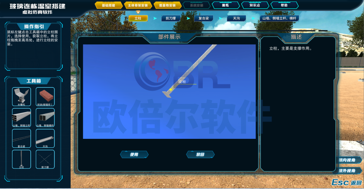 以玻璃连栋温室搭建为例:模拟温室从地基到环境系统的搭建过程及温室远程监控系统,包括基础搭建、主体骨架安装、覆盖物安装及系统安装。通过对温室搭建虚拟仿真软件,可以让用户对连栋温室的建造过程、温室结构、生产使用的认识,巩固所学的理论知识。