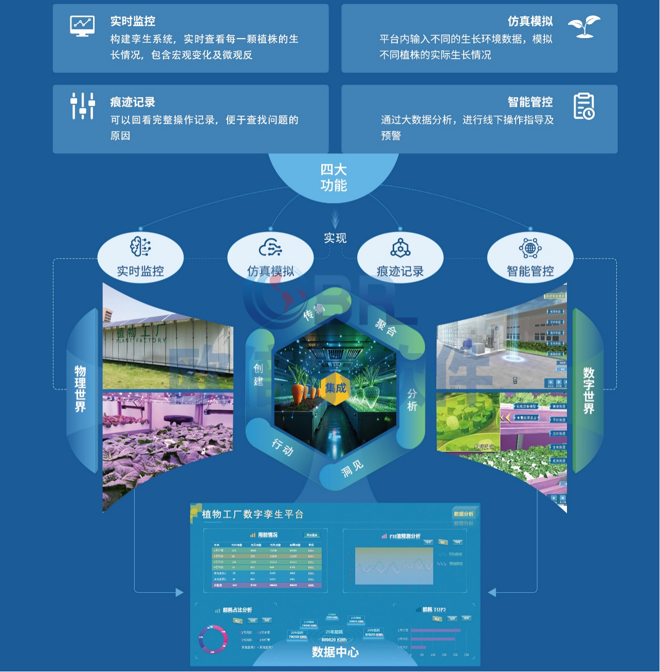 具备实时监控、仿真模拟、痕迹记录、智能管控四大功能,通过构建孪生系统,实时查看每一颗植株的生长情况;平台内输入不同的生长环境数据,模拟不同植株的实际生长情况;可以回看完整操作记录,便于查找问题的原因;通过大数据分析,进行线下操作指导及预警。