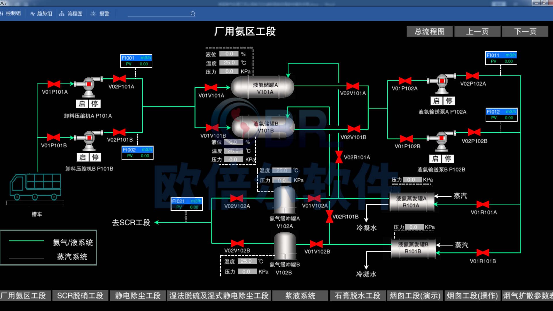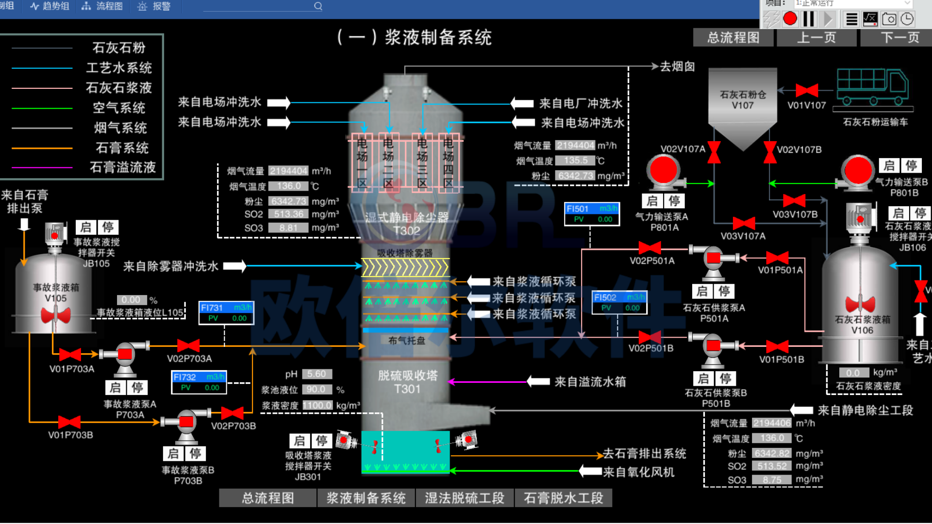 燃煤电厂大气污染物排放协同控制及迁移扩散虚拟仿真实训教学软件以3D形式展示典型烟气处理的真实生产工艺过程,全面仿真模拟氨区操作、SCR脱硝过程、静电除尘过程、湿法脱硫操作、湿式电除尘操作、石膏脱水工艺等,以及配套的工艺原理。学员可以在仿真工厂环境中漫游,学习典型烟气处理工艺的工厂设计要求,在环境中可以实现360°旋转。将工艺流程制作成多个工序,实现工厂仿真模拟功能,文字形式展示工艺知识点,对工艺流程进行理论学习。