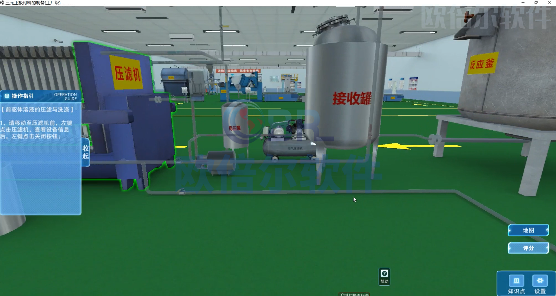 软件模拟工厂级三元正极材料的制备操作,涵盖原料溶液配制、共沉淀反应、前驱体离心干燥、过筛磁选、锂化混合、固相反应、成品破碎、气流粉碎、批混处理及包装入库等全流程工艺,具备智能评分、操作指引、知识点讲解等功能。