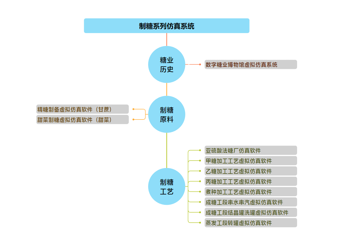 精糖制备虚拟仿真软件按照《食糖制造工国家职业标准》中的职业标准设置了初级工、中级工、高级工三个模块,分别对技能要求依次递进,软件将精糖制备过程分为甘蔗提汁、澄清、蒸发浓缩、结晶、分蜜、干燥冷却、熟化包装七个工段,完整再现了精糖制备过程中的设备运行原理、物料走向、工艺参数设定及控制、品质检测等操作要点,并对重点设备以拆分、视频等形式进行原理展示、软件为中英双语版本。