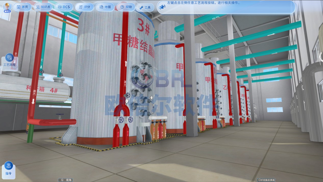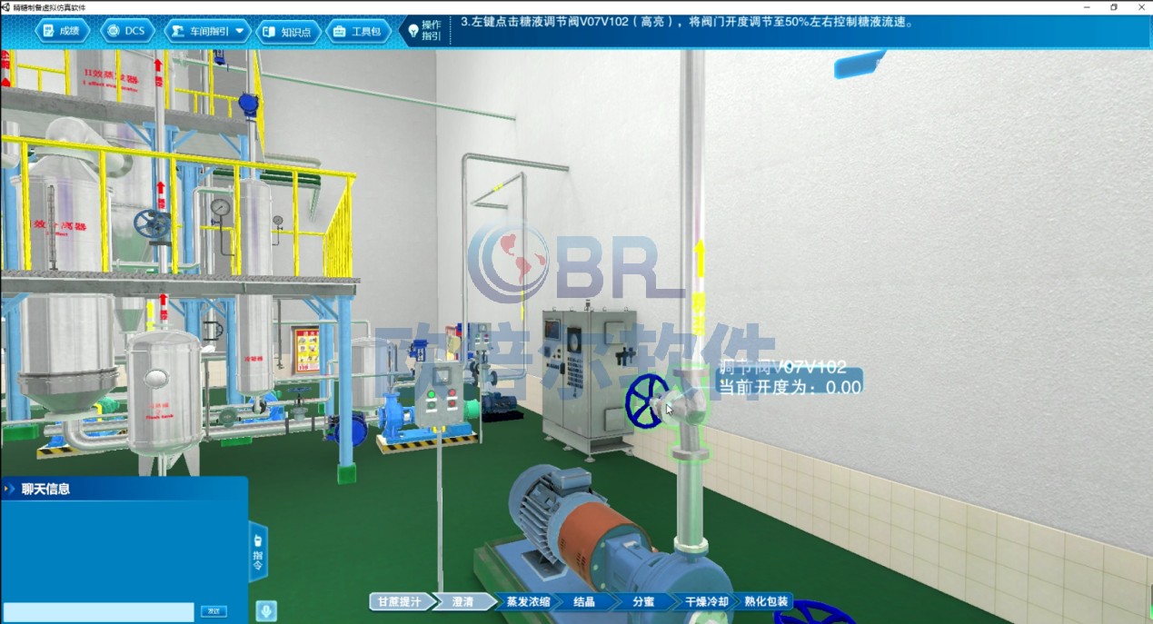 甜菜制糖虚拟仿真软件以甜菜为原料展现制糖生产过程,包含甜菜提汁、澄清、蒸发浓缩、结晶、分蜜、干燥冷却、熟化包装七个工段,依据实际甜菜制糖生产拍摄场景进行车间布局模型搭建,按实际实验过程完成交互,完整再现了以甜菜为原料进行食糖制备过程中的设备运行原理、物料走向、工艺参数设定及控制、品质检测等操作要点,并对重点设备以拆分、视频等形式进行原理展示。