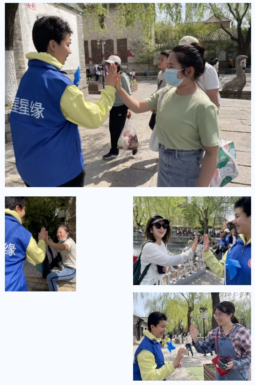 活动现场,欧倍尔关爱基金会的的志愿者们陪伴“星星的孩子”进行表演,带领他们一起和路人击掌,让孩子们感受来自陌生人的善意,同时也让社会大众关注这个群体。草长莺飞、柳絮飘飘的温暖春日,百花洲游客络绎不绝,孩子们精彩的非洲鼓表演吸引了众多游客驻足观看,义卖的作品也琳琅满目。志愿者们给大家分发了自闭症的科普传单,呼吁大家给予自闭症家庭更多宽容、理解和支持,为打造“就学无障碍、就业无障碍、就医无障碍、出行无障碍、社区生活无障碍”的社会环境献出自己的一份力量。