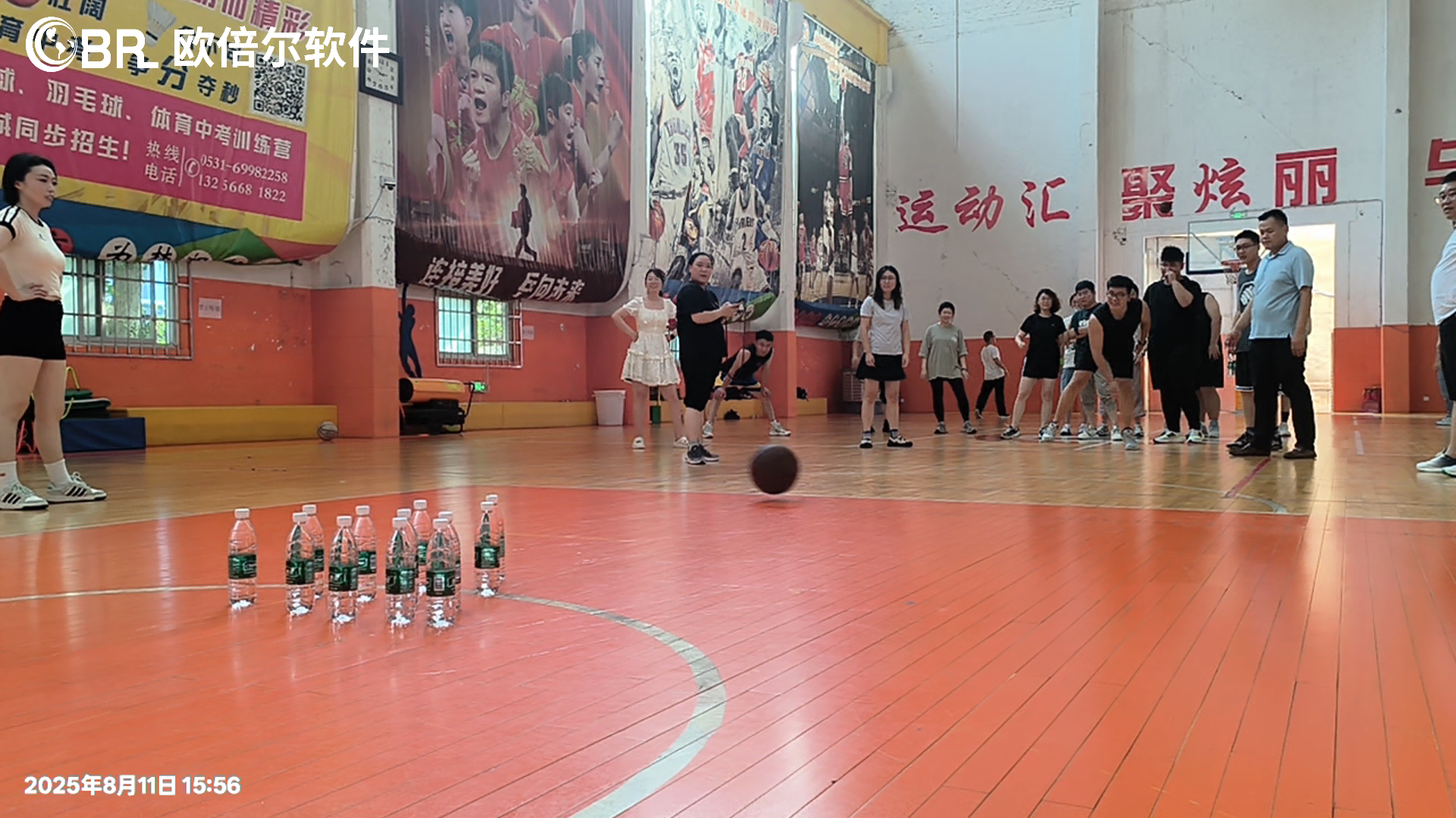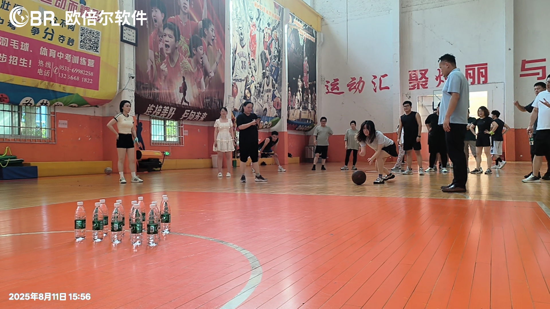 趣味篮球赛篮球保龄球要求每组2人,过障碍用篮球击中水瓶,击倒多着获胜每组一次机会,积分相同加赛一轮。